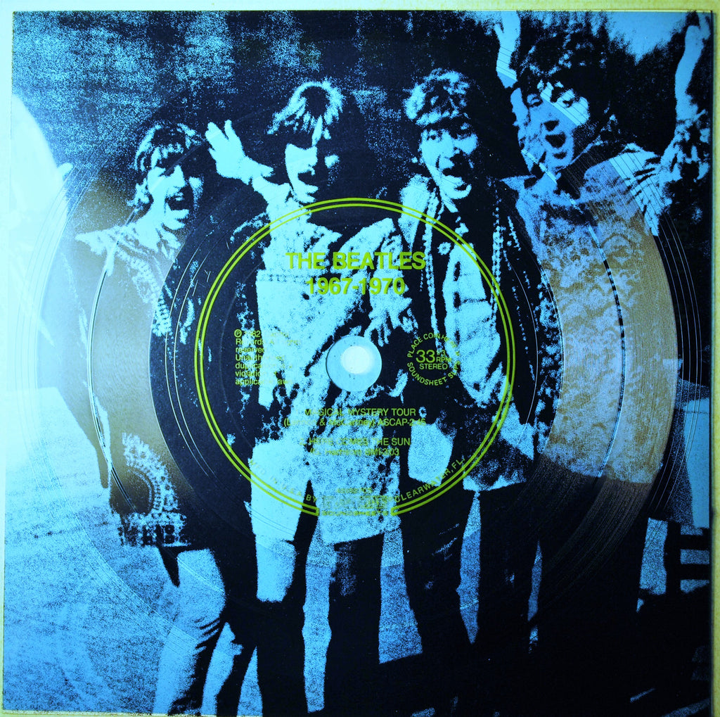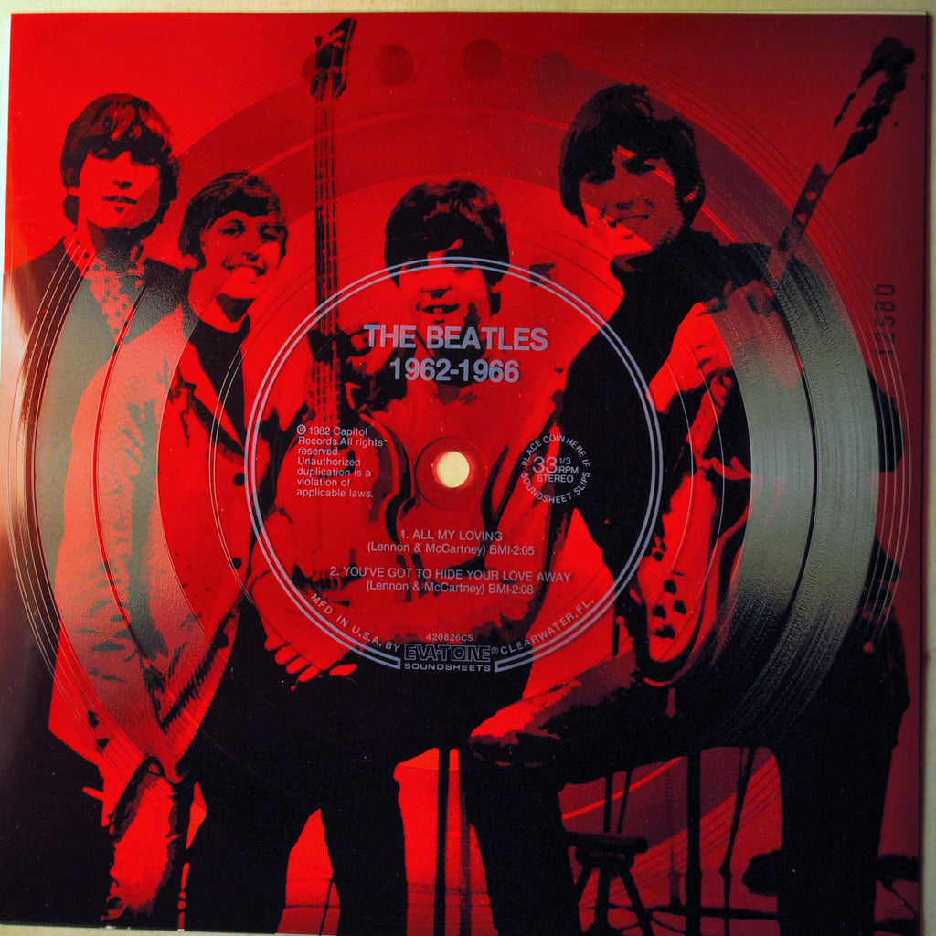 These "red, white, and blue" flexi discs were issued by Capitol as promotional giveaways Iin 1982 to encourage the sale of the Capitol catalog of Beatles LPs. The transparent 7-1/4" square discs were adhered to a card with photos of the group on the front visible through the soundsheet. RED(Capitol Records – 420826CS) "All My Loving" & "You've Got To Hide Your Love Away" # 12580, BLUE (