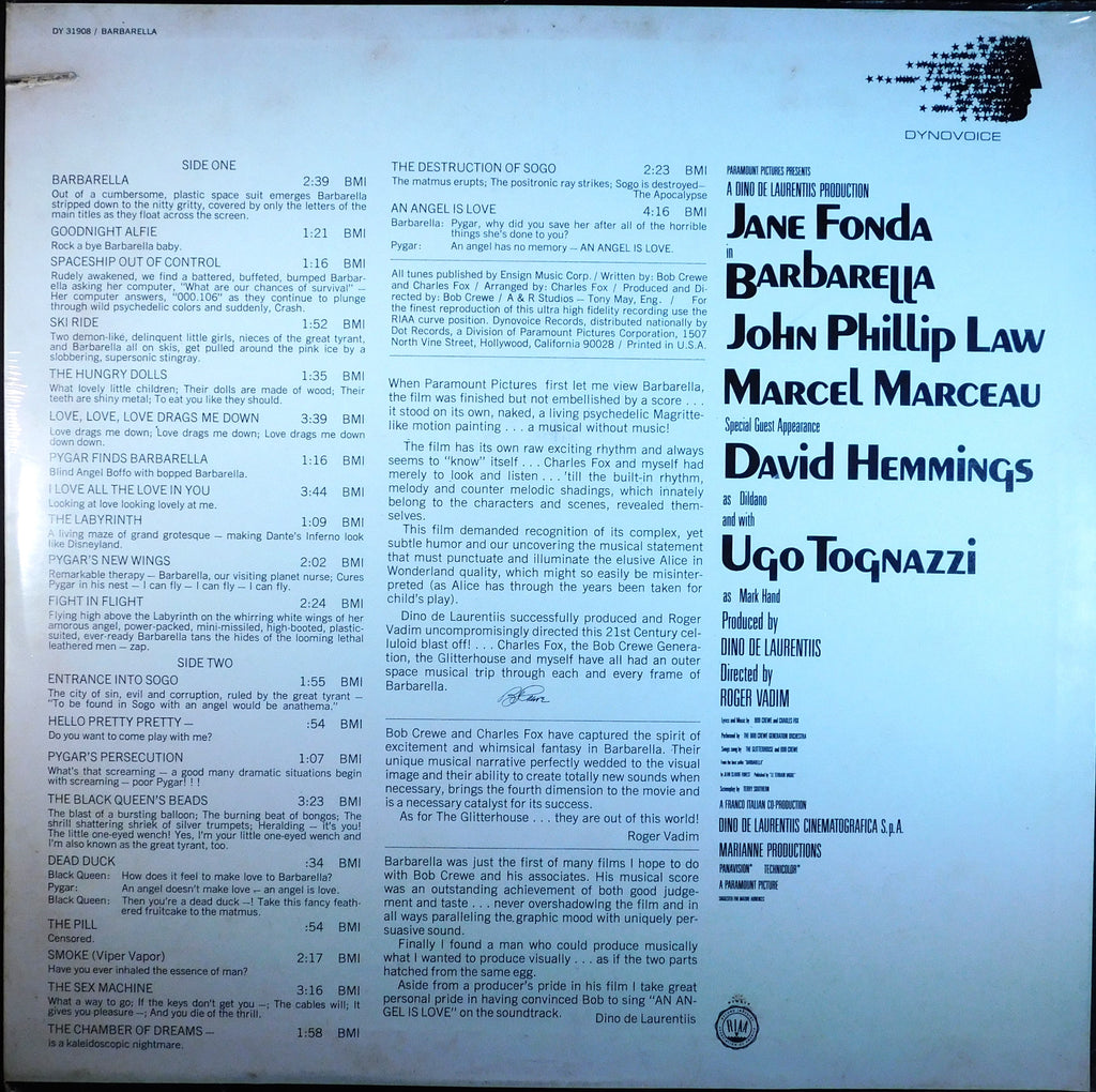 This is a SEALED copy of the soundtrack for the 1968 sci-fi film Barbarella starring Jane Fonda. Put out on the Dynovoice label (DY 31908), the soundtrack is similar to that of the lounge of the 60s, but with an intergalactic influence.