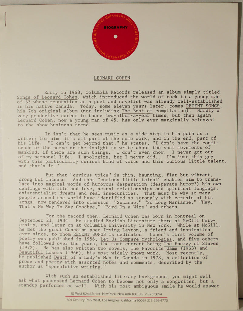 Here's a unique offering, this is a White Label Promo with publicity photo & biography from Columbia Records of Leonard Cohen's " Recent Songs " ( Columbia – JC 36264) The Vinyl is Very Clean (VG+) and the cover, photo & biography all from 1979 are like New. The Recent Songs: The Guests, Humbled In Love,The Window, Came So Far For Beauty, The Lost Canadian, The Traitor, Our Lady Of Solitude, The Gypsy's Wife,The Smokey Life &  Ballad Of The Absent Mare.